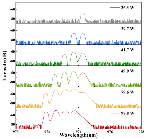 图中所示的结果表明,在光谱中较短波长处观察到的峰数随着泵浦功率的增加而增加,这表明在输出中高阶模式的出现率有所提高。这种模式行为可归因于泵浦源的多模特性。随着功率的增加,高阶模式的拉曼激光依次达到阈值。这些现象在光谱中体现如下:随着泵浦功率的升高,长波长处的峰值强度会减弱,而短波长处则会出现新的峰值。