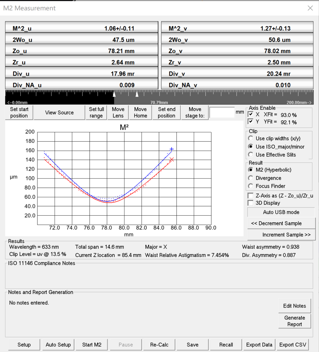 然后,通过软件的功能,电控导轨会自动进行M²因子的测量,并在测量结束之后进行计算。