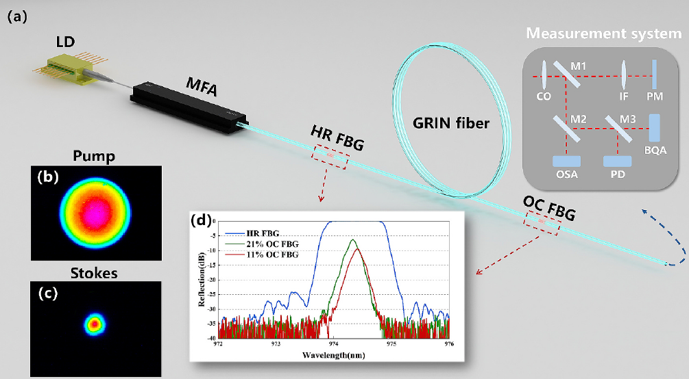 拉曼光纤激光器(RFL)因其灵活的工作波长在众多应用中发挥着重要作用。多模光纤(MMF)中固有的复杂多模非线性过程已在多个领域得到探索,包括时空锁模光纤激光器、信息传输和非线性控制。最近,有关多模非线性系统中模耦合与非线性效应相互作用导致的模不稳定现象已有报道。在梯度折射率反射式激光器(GRIN RFL)中,随着功率的增加,高阶斯托克斯光的产生给非线性动力学带来了额外的复杂性。然而,对于梯度折射率反射式激光器中这些多模态非线性过程的理解仍然有限。这将显著影响性能。现有的关于梯度折射率拉曼光纤的研究工作主要集中在提高功率和亮度方面。